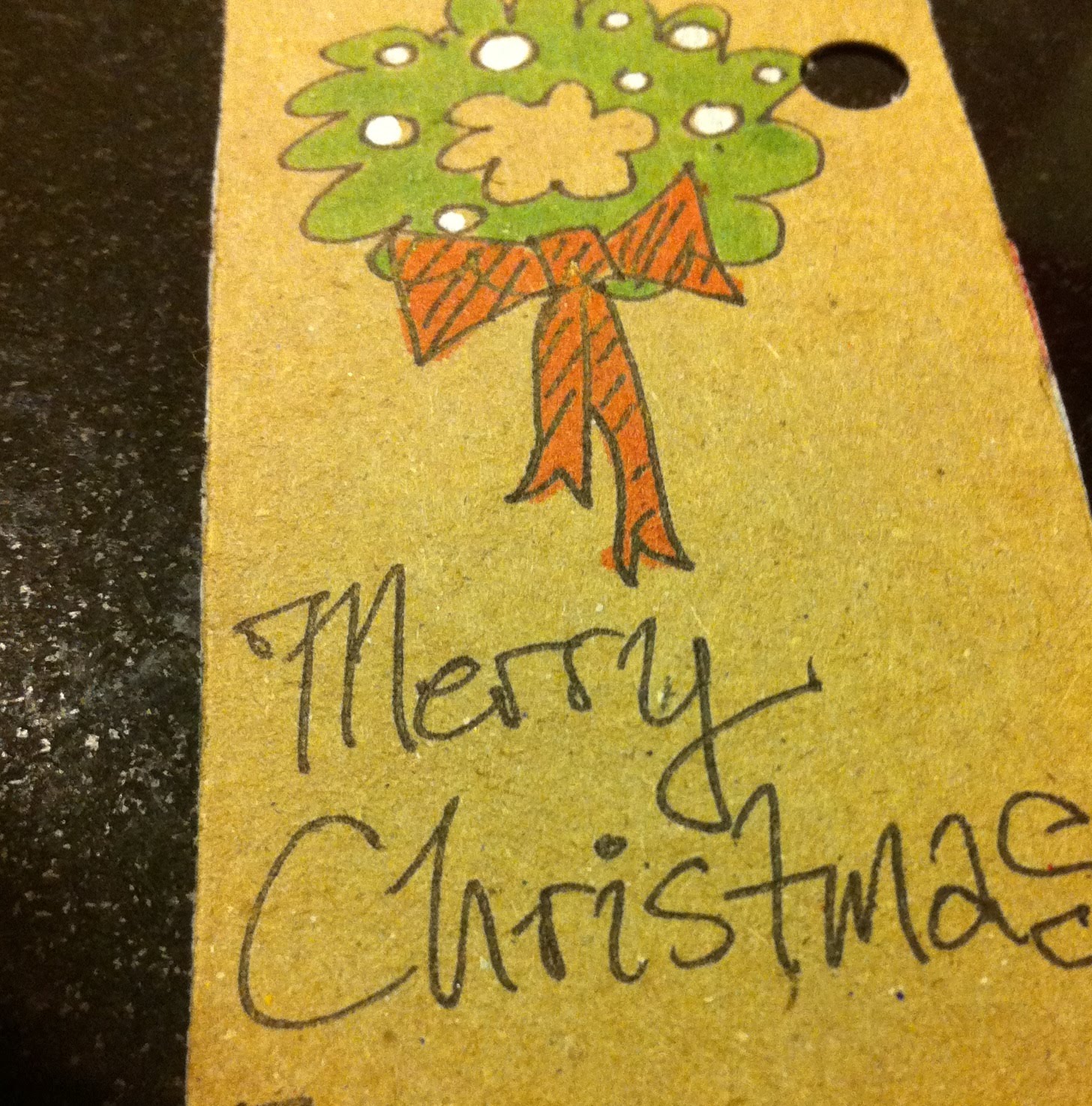 3. With the black pen, sketch out the shape of a wreath, a bell, a stocking, etc. It doesn’t have to be perfect! (see below pics. click to enlarge) I wrote Merry Christmas in a scripty way then darkened it in a little. With the markers, fill in some color, but not too much. With the silver sharpie, make little embellishments!